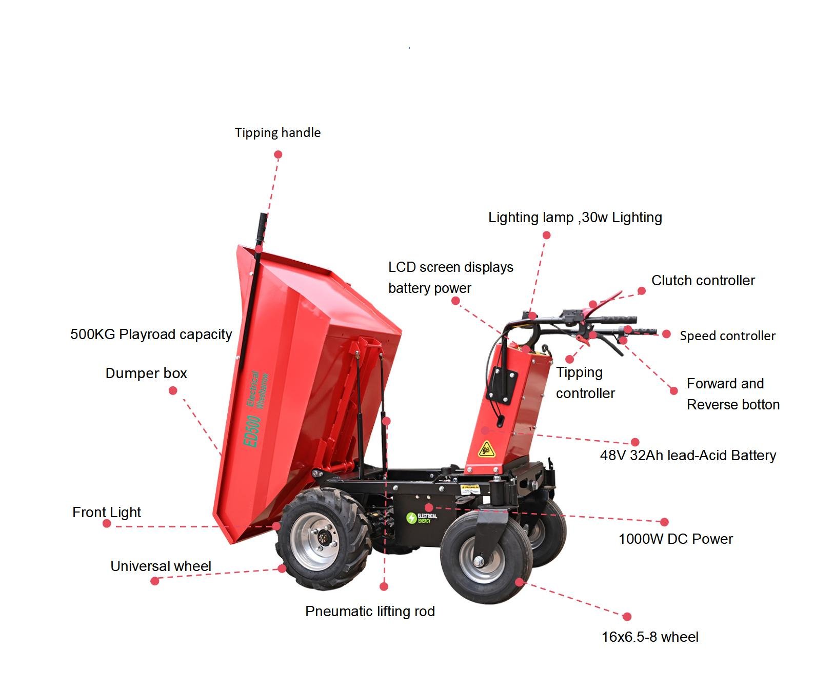 It is a truck designed for carrying bulk materials, usually on construction sites. It carries materials efficiently, ensuring intensive work cycles. The machine occupies a small area and is easy to drag. The operation is simple, and the driving smoothness is good. Electric design allows you to complete the operation work silently and efficiently.