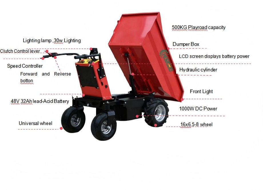 It is a truck designed for carrying bulk materials, usually on construction sites. It carries materials efficiently, ensuring intensive work cycles. The machine occupies a small area and is easy to drag. The operation is simple, and the driving smoothness is good. Electric design allows you to complete the operation work silently and efficiently. Electric mini dump truck ED500H, equipped with 48v 1000w battery system, this wheelbarrow can provide maximum versatility and light touch operation. The ED500H Mini Dump Truck features an 1100lbs load capacity and hydraulic bucket for use indoors or outdoors, and its compact size will allow passage through doorways/driveways as small as 29in, providing excellent load capacity and productivity. This mini dump truck has an electromagnetic braking system, which can significantly reduce the wear and tear of the system as there is no need for physical contact to create friction between components. It requires almost no maintenance costs. It has forward and reverse transmission and can be rotated 360 degrees. Convenient to use in narrow areas.
