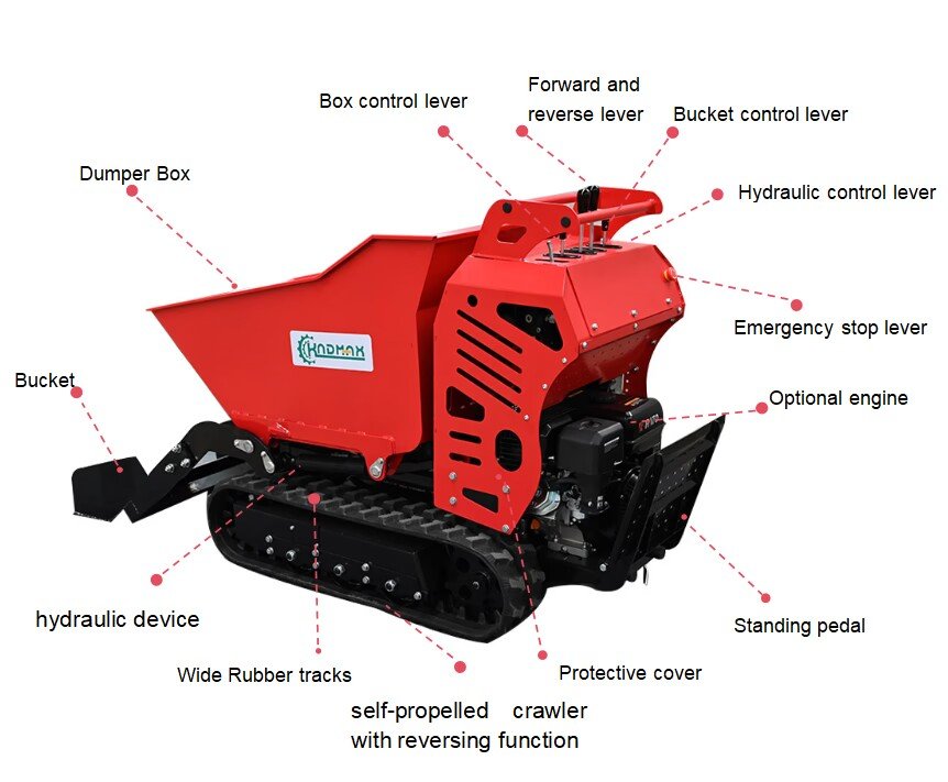 All-terrain crawler dumper, the crawer dumper replaces traditional wheeled walking with rubber tracks,large carrying capacity,strong grip and low noise, at the same time, the crawler type walking device increases the contact area between the machine and the ground, Do not harm farmland and roads, Has good driving and through performance, it can adapt to complex anddifficult road conditions such as paddy fields, marshes, and muddy field roads. The specific size can be customized according to your needs. Strong carrying capacity, strong climbing ability, simple operation and convenient maintenance.